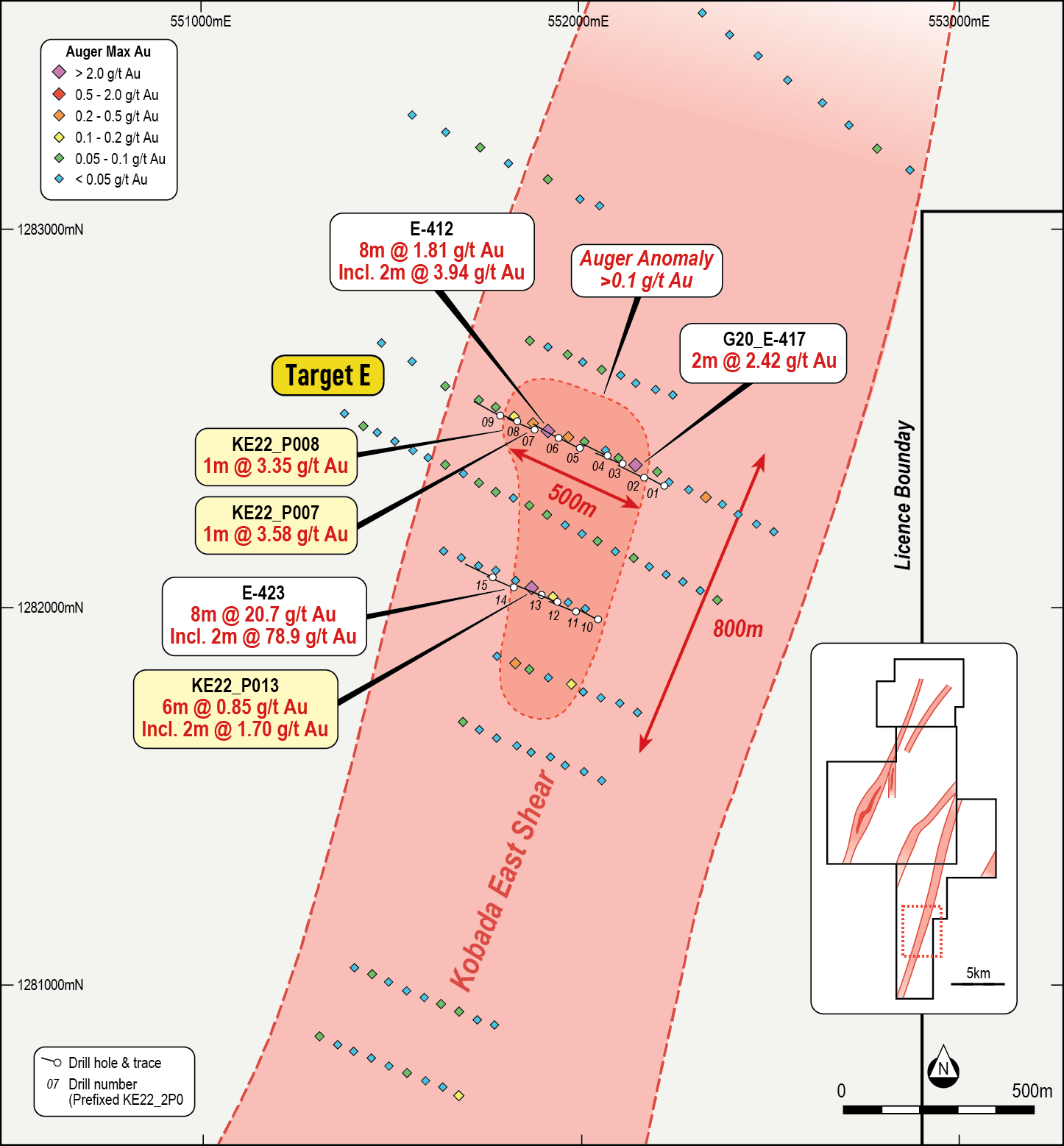 - 6m at 0.85g/t incl. 2m at 1.70g/t (KE22_P013)