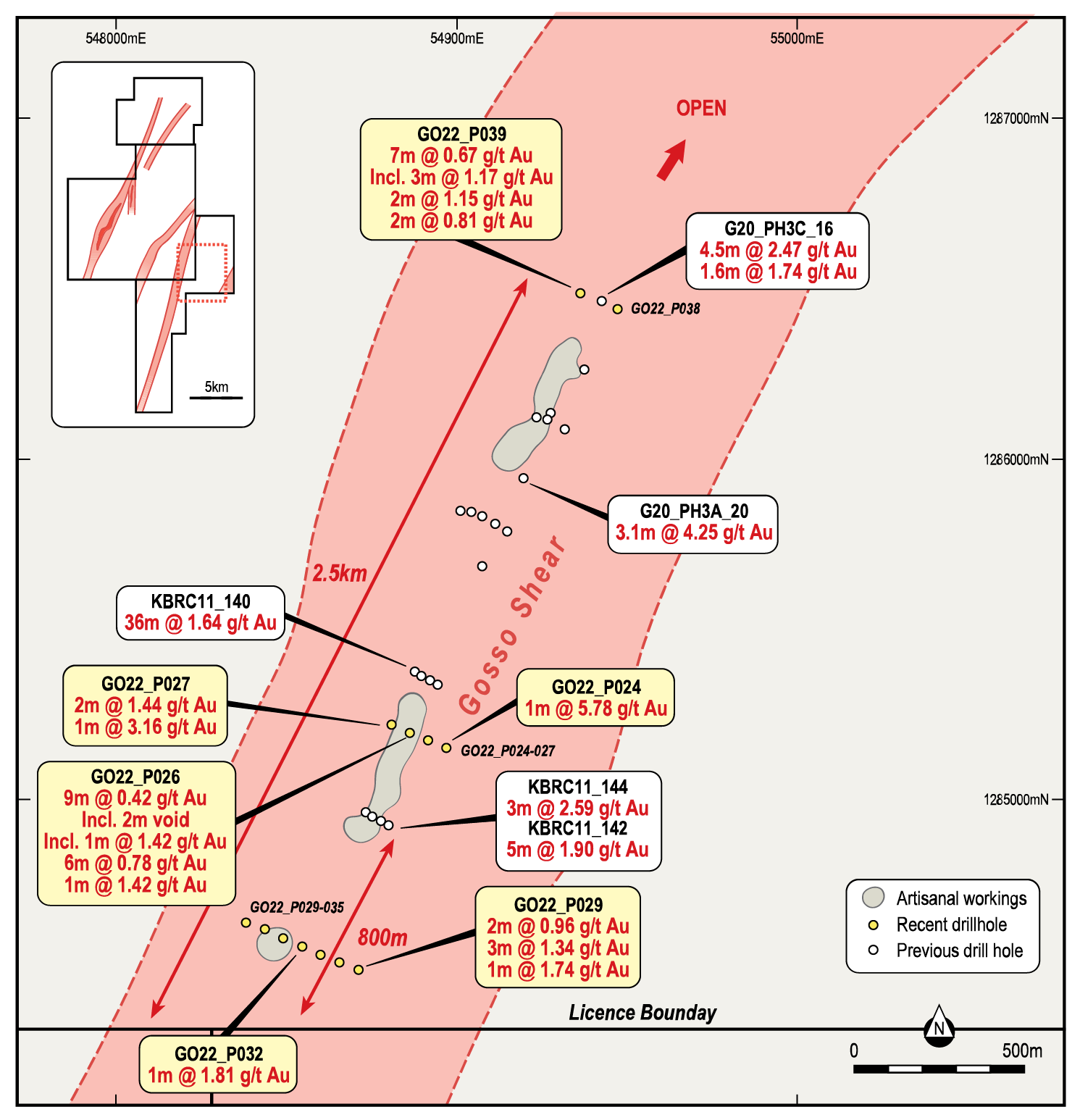 - 11m at 0.55g/t, 2m at 2.66g/t and 3m at 1.12g/t