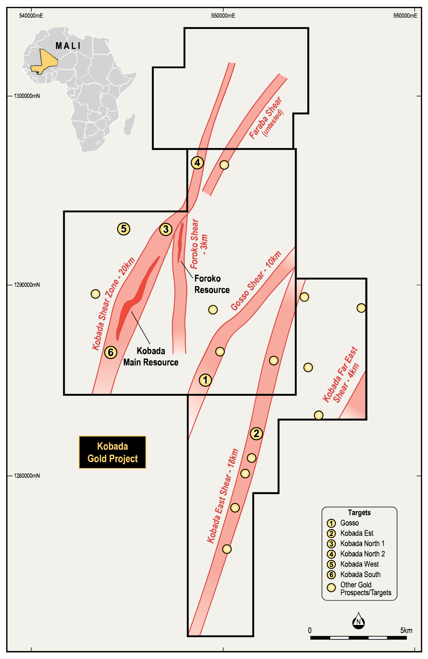 Kobada is a large gold system in a prolific gold district with numerous near-surface targets and over 153,000m of drilling thus far that has been primarily focused on the Kobada Main shear deposit.